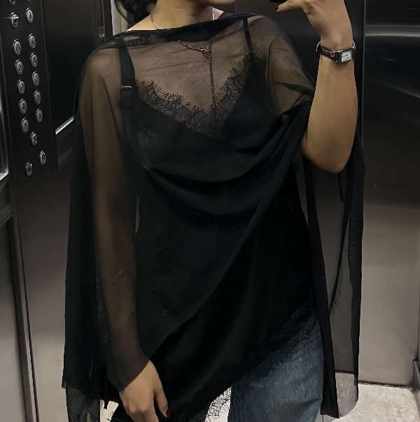 Sobrecapa elaborada en Microtul elastizado, mide 2.14 mts de largo y 54cm de ancho, viene con un aro en dorado el cual puedes usar para darle distintas formas, lo puedes adaptar a cualquier look en especial si lo usas en conjunto con el último drop Midnight, los escotes, detalles de puntilla, bralette, de este último drop va perfecto con este tipo de transparencias.
