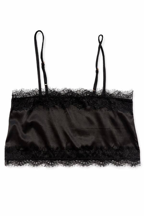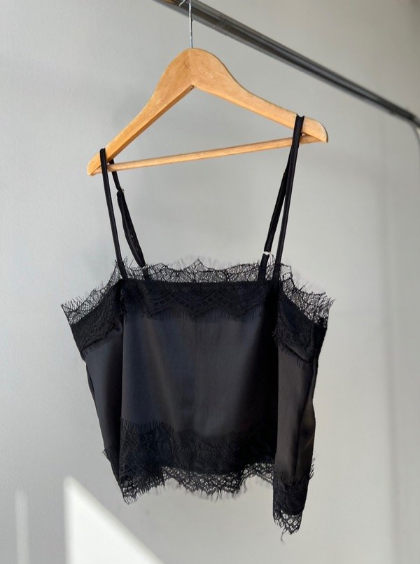 Top corte recto elaborado en satín con detalles de encaje/puntilla rígida en bordes y breteles ajustables.